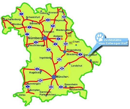 | Wenn Ihr uns mal besuchen möchtet, Fragen habt oder Ihr Informationsmaterial von unseren Hunden wünscht, ruft uns einfach mal an: 0 85 45 / 10 65 bzw. mobil: 0170 - 5 34 25 13 an oder schreibt eine Mail an: weisseschaeferhun.de@freenet.de Wir wohnen in der Nähe der A3 (E56) zwischen Deggendorf und Passau; fast an der Ausfahrt Garham. Entweder wartet Ihr auf uns am Pendlerparkplatz direkt neben der Autobahnauffahrt oder für den Fall, dass Ihr euch selber auf die Socken machen wollt, findet Ihr unten Landkarten (durch anklicken wird der Maßstab vergrößert...) Bis bald also... | |