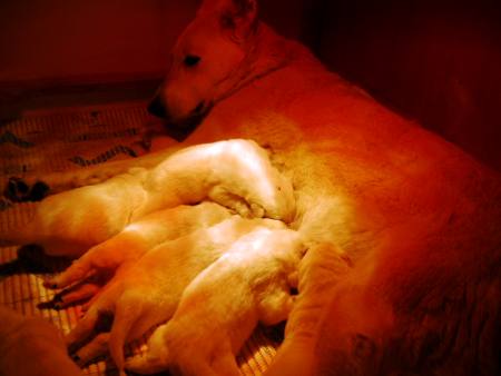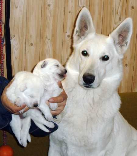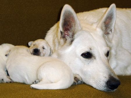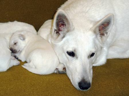 Halbgeschwistern in die Wurfkiste schnuppern. Am Anfang ist Mama Sheyla